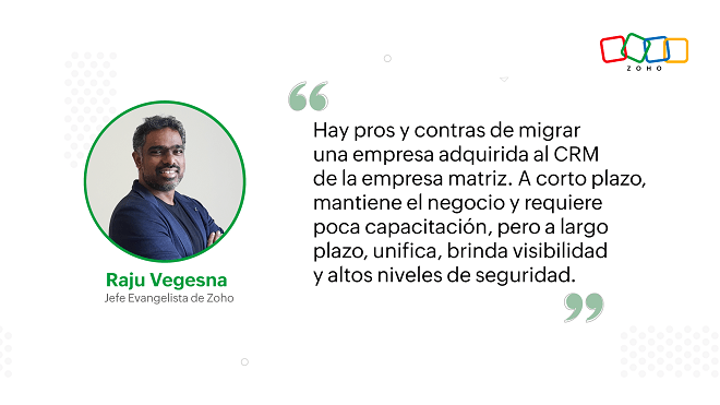 Existen argumentos a favor y en contra de que una empresa recién adquirida migre al CRM de la empresa matriz. A corto plazo, tiene sentido mantener el negocio como siempre, incluso si el comprador y el adquirido utilizan sistemas diferentes. Esto requiere un mínimo de capacitación y permite generar impulso antes de que ocurran cambios más grandes. Sin embargo, a largo plazo, unificar las empresas con el mismo CRM brinda visibilidad de toda la organización, permite analizar todos sus datos y garantiza altos niveles de seguridad.